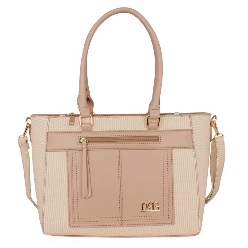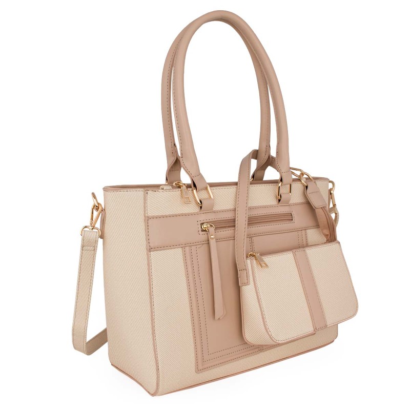 Women's nute shoulder bag. Eco-friendly leather. It has 2 internal compartments, one with a zipper, and 3 external pockets with zippers on the front and back. Adjustable, detachable crossbody strap. Extra detachable pouch with zipper. Dimensions: H 28cm, L 34cm, W 12cm. "Designed in Greece exclusively by De Raggi designers".